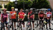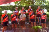 Anläßlich einer Spendenübergabe an die Nepalhilfe Beilngries e. V. sind acht Rennradfahrer vom Radsportverein Schrobenhausen nach Beilgries geradelt. Vorne von links: RSV-Chef Franz Kistler, Hermann Büchl, Manfred Lindner von der Nepalhilfe, Johann Schinagl, Michael Büchl. Hinten von links: Oskar Seidel, Wilhelm Schels, Thomas Fieger und RSV-Finanzchef Anton Reisner